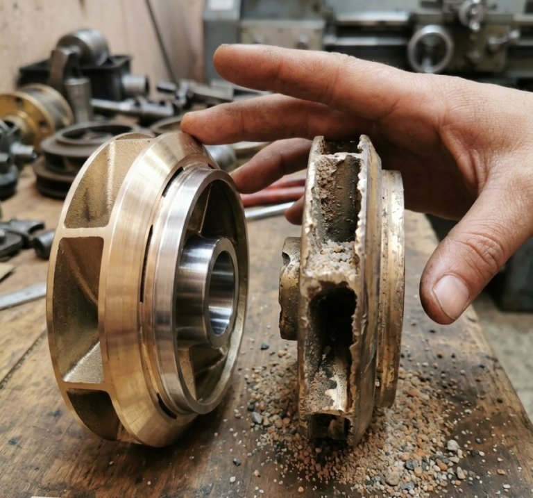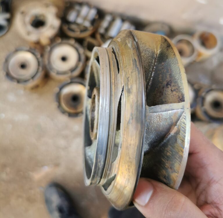 Dans nos forages régionaux, la présence de particules abrasives est une réalité constante. Imaginez l’effet d’un papier de verre tournant à grande vitesse : le sable ronge progressivement les turbines, qu’elles soient en Noryl / fonte en Inox. Ce phénomène élargit les jeux de fonctionnement internes, créant une fuite invisible à l’intérieur même de la pompe. Le moteur peut sembler tourner à plein régime, mais une grande partie de l’eau “tourne en rond” dans la partie hydraulique au lieu de remonter vers la surface